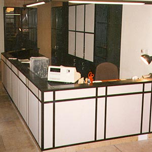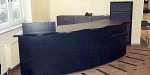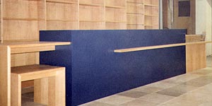Theke und Kassenbereich in Amt für Kultur. Grundkonstruktion Holzleisten massiv mit Stoffbespannung. |