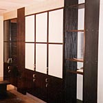 Rückwand zu oben abgebildeter Theke. Eiche massiv, dunkel gebeizt. Stoffbespannung. |